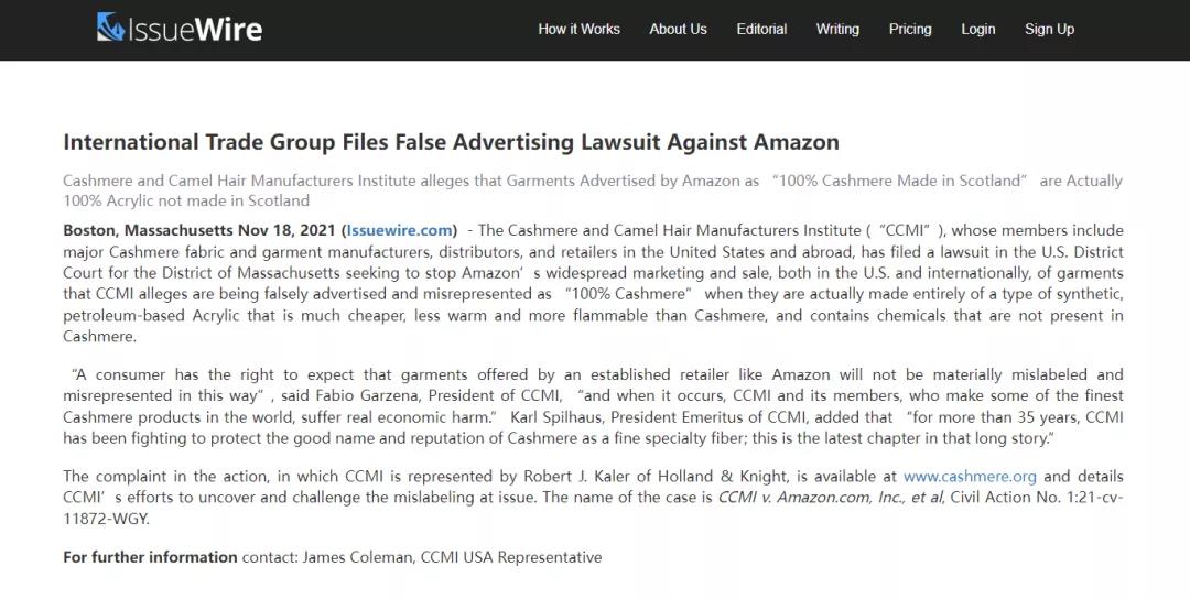 据悉,羊绒和骆驼毛制造商协会(CCMI)已向美国地方法院提起诉讼,要求亚马逊立即下架相关产品,停止将非羊绒产品宣传成羊绒产品的虚假销售行为,并根据马萨诸塞州消费者保护法支付相应的赔偿金。