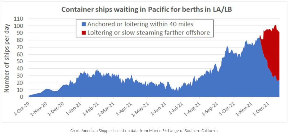 据洛杉矶港最新数据,LA/LB港口外共有89艘集装箱船排队等候,港口40海里范围内船舶等待靠泊的平均天数为18.9天。