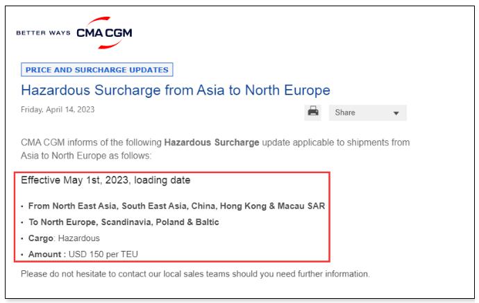 近日,达飞发布两项关于从亚洲到北欧航线的收费公告,5月1日开始征收危险附加费、超重附加费。