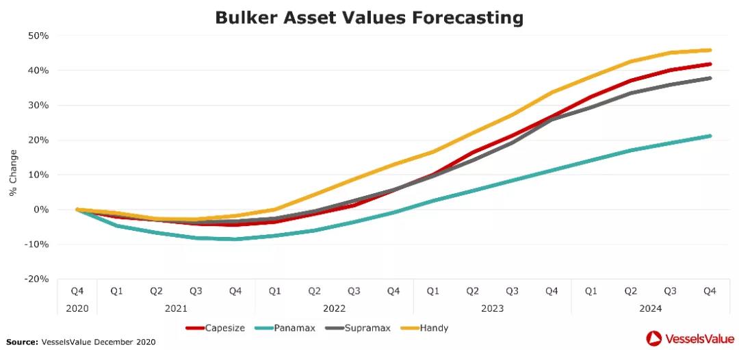 好望角型干散货船租金在2020年10月份攀升至近34000美元/天的季度峰值,之后又在12月中旬降至10000美元/天左右的低水平。