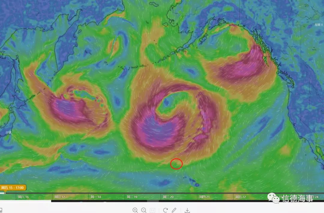 本文我们重点探讨一下关于气象导航方面的问题。分析本次Maersk Essen轮的航行轨迹显示,我们可以看到该轮遭遇了近期北太平洋上的一个低压气旋的外围。